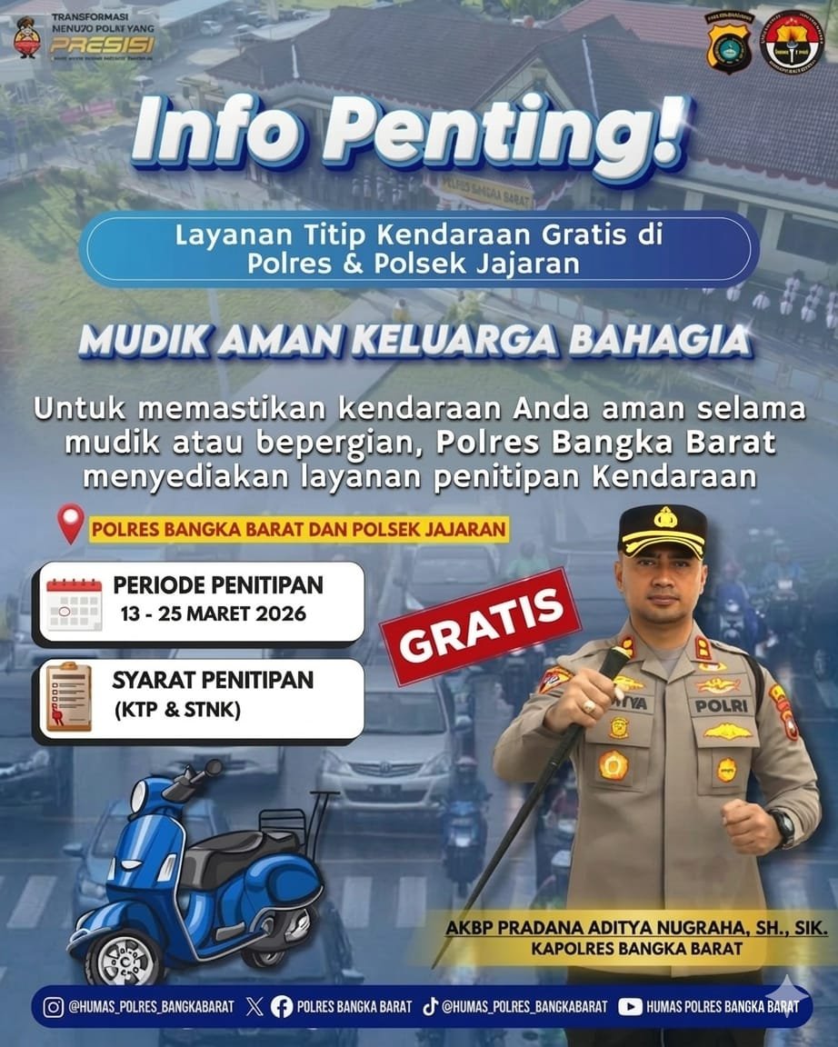 “Layanan ini kami siapkan untuk membantu masyarakat Bangka Barat yang ingin mudik atau bepergian. Kendaraan bisa dititipkan secara gratis di Polres Bangka Barat maupun di seluruh Polsek jajaran,” ujar Kapolres, Minggu (15/3/2026).