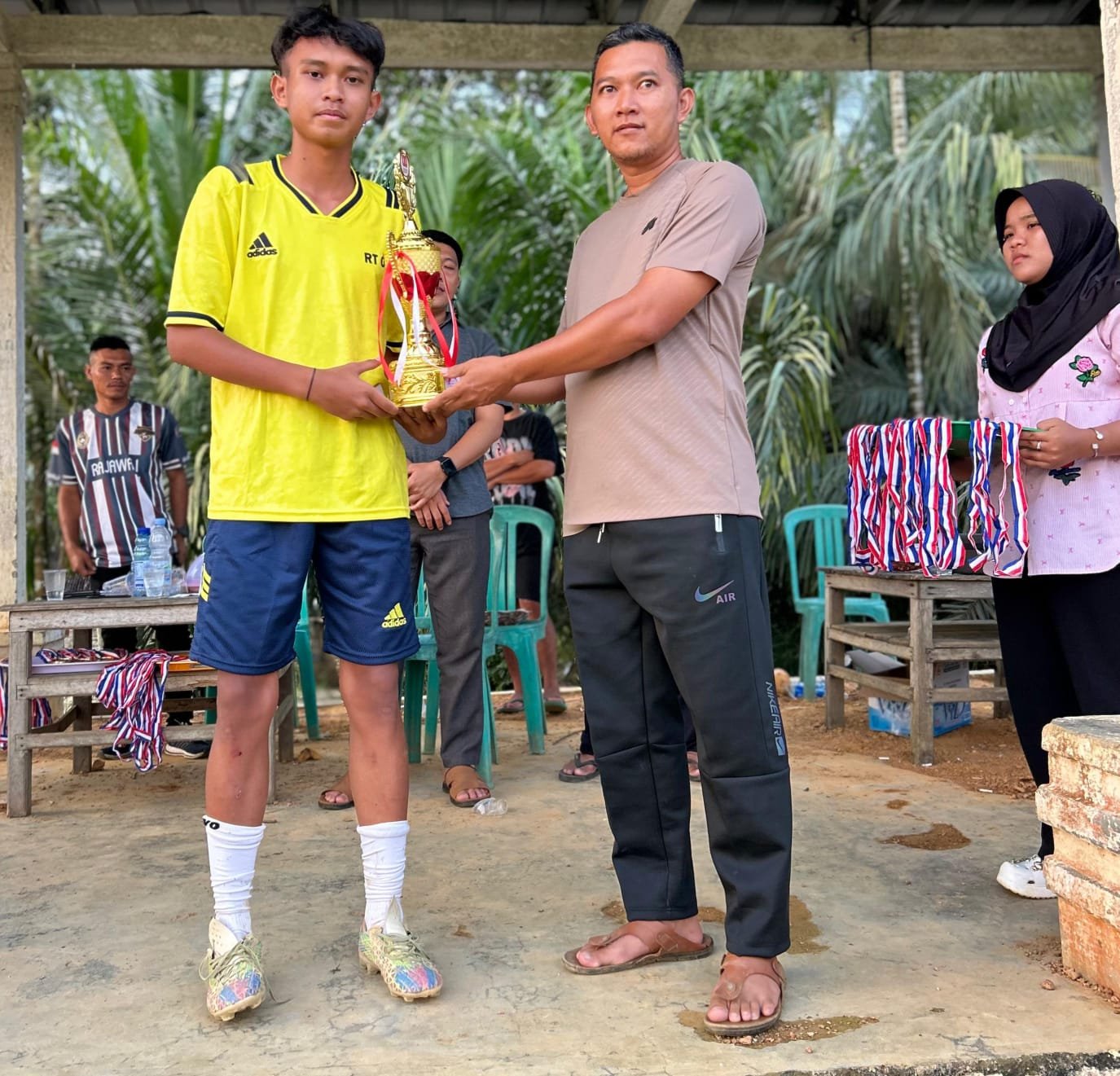 Sekdes Tiang Tarah Serahkan Piala Juara III Turnamen SEPAK BOLA DESA TIANG TARAH HUT RI